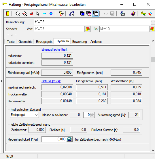 Der aktuelle hydraulische Zustand der Haltung wird bei jeder hydraulischen Berechnung neu ermittelt und hier angezeigt. Eine Veränderung ist hier möglich. Zu beachten ist, dass die vorgenommene Veränderung durch die nächste hydraulische Berechnung der Haltung verändert werden kann.