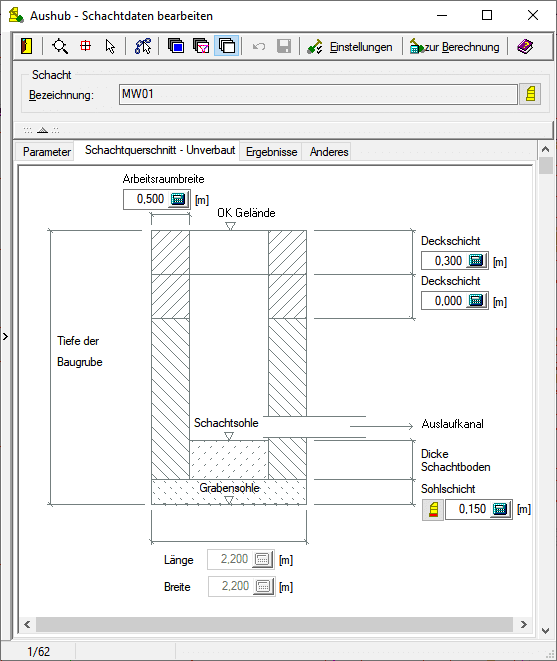 In der Karteikarte Schachtquerschnitt erfolgt die Anzeige des Querschnittes der Schachtbaugrube je nach Grabenart mit seinen Parametern.
