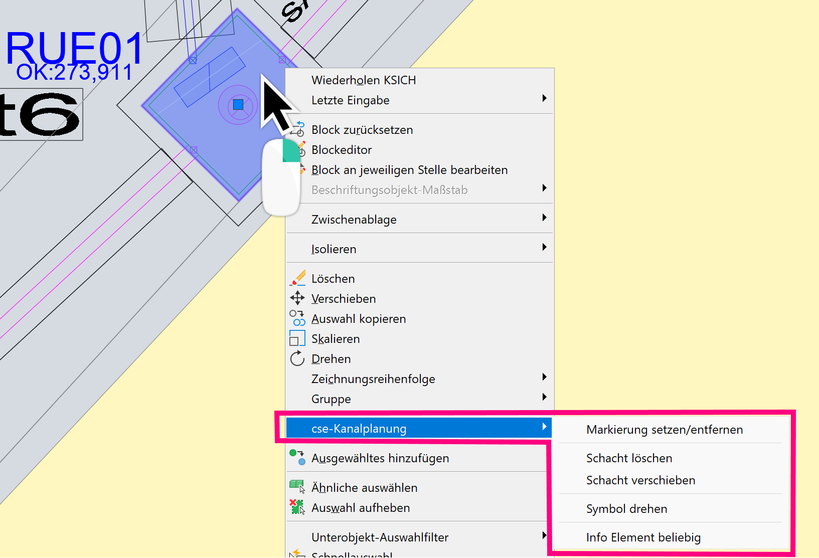 cseTools-Funktionen sind über das Kontextmenü des CAD verfügbar |
