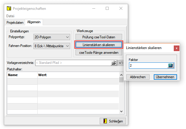 Eine weitere Möglichkeit, Linienstärken zu skalieren befindet sich in den Projekteigenschaften. Hier gibt es auf der Registerkarte „Allgemein“ das Werkzeug „Linienstärken skalieren“. Die Eingabe des Skalierungsfaktors erfolgt an dieser Stelle über eine separate Eingabemaske.