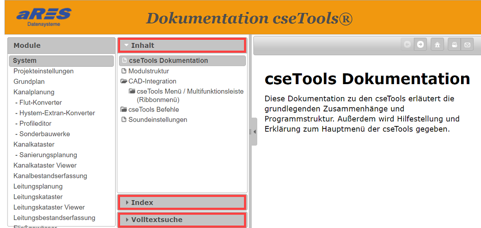 Auf der linken Seite sehen Sie die Navigation durch die gesamte Dokumentation. In der ersten Spalte finden Sie die Übersicht der einzelnen Module. Wählen Sie eines der Module aus, dann können Sie in der zweiten Spalte durch den Inhalt blättern oder nach einzelnen Begriffen suchen.