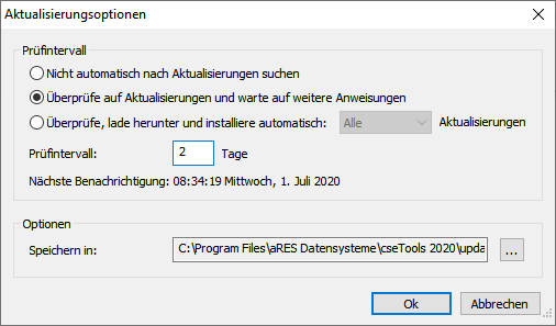 Die Automatische Updateprüfung findet immer beim Start des Basis-CAD im hier vorgegebenen Intervall statt.