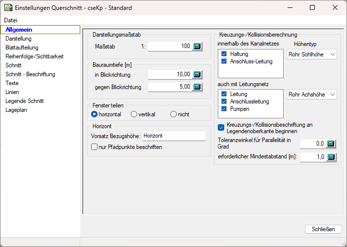 Im Register Allgemein befinden sich Einstellungsmöglichkeiten für Maßstab, Kreuzungs-/ Kollisionsberechnungen, Bauraumtiefe, Fenster teilen und Horizont.