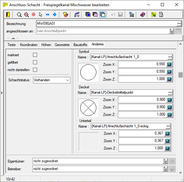 Spezielle Bedeutung hat der Status=fiktiv und Status=fiktiver Punkt mit Nummer, d.h. es liegt lediglich projekttechnisch ein Schacht vor, an diesem Punkt existiert jedoch kein Schachtbauwerk.