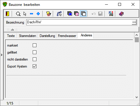 Die Registerkarte Anderes beinhaltet die Statusinformation zur Bauzone. Es können mit den zugehörigen Kontrollkästchen die Attribute markiert und gefiltert gesetzt, sowie die Sichtbarkeit der Geometrieelemente geregelt werden. Wird eines dieser Attribute einer Bauzone geändert, wirkt sich das auf alle Einzugsgebiete an denen diese Bauzone angeschlossen ist, aus. D.h. es werden alle betroffenen Einzugsgebiete markiert, gefiltert oder nicht sichtbar geschalten.