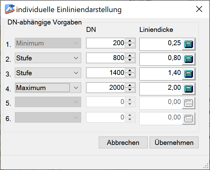 Über die Option individuell kann eine eigene Staffelung für die Zuordnung zwischen DN und zu verwendender Linienstärke vorgegeben werden.