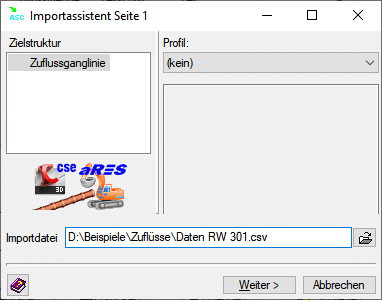 Die Auswahl der Zielstruktur, der Profildatei und der Importdatei erfolgt in dem gezeigten Dialog.