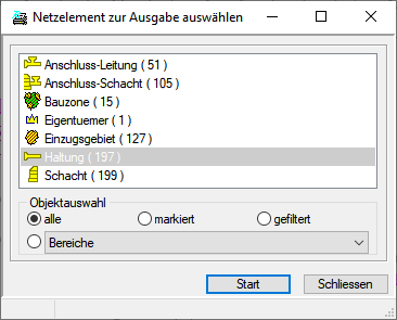 Wählen Sie ein Netzelement aus, dessen Datenobjekte Sie ausgeben wollen. Mit Objektauswahl können Sie auf bereits in der Datenbank markierte oder gefilterte Objekte zurückgreifen.