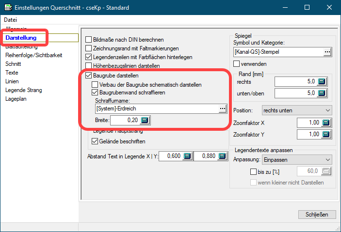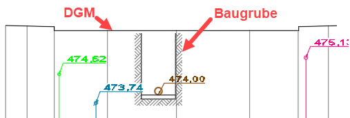 Um die Darstellung eines Rohrgrabens im Schnitt zu bekommen ist es notwendig für das Objekt zuvor eine Aushubberechnung durchgeführt zu haben. Im Bereich „Darstellung“ der Querschnittseinstellungen können dann die entsprechenden Parameter für die Baugrubendarstellung vorgegeben werden. Das ggf. für die Aushubberechnung verwendete DGM sollte auch als DGM für die Schnittdarstellung (siehe 2. - Digitales Geländemodell) eingestellt sein.