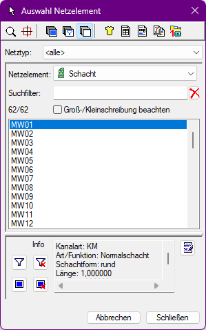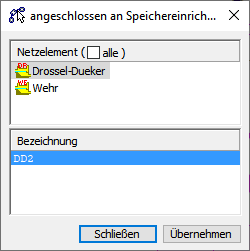Über das Eingabefeld Netzelement wird das gewünschte Netzelement dessen Objekte auf das aktuelle Bauwerk verweist, eingestellt. In dem Listenfeld Bezeichnung wird dann das Objekt dessen Daten angezeigt werden sollen, ausgewählt.