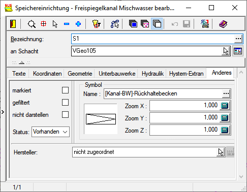 Die Registerkarte Geometrie ist nur bei den Bauwerksklassen Speichereinrichtungen, Trenn- und Aufbereitungsanlagen, Kläranlagen, Pumpen, Wehre-Überläufe, Drosseln-Düker und Schieber vorhanden.