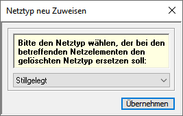 Mit der Funktion Netztyp löschen wird der aktuelle Netztyp aus dem Projekt entfernt. Der letzte Netztyp kann nicht aus dem Projekt entfernt werden, damit sichergestellt ist, dass immer mindestens ein Netztyp existiert. Wird ein Netztyp gelöscht, dem Kanalelemente zugewiesen sind, erfolgt eine Abfrage eines alternativen Netztyps, dem diese Elemente zugewiesen werden sollen.