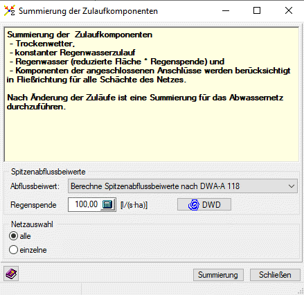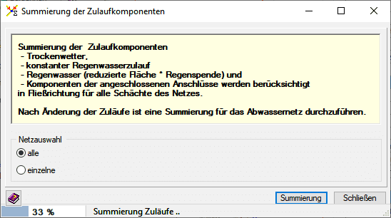 eine Zulaufsummierung für das oberhalb liegen Kanalnetz durchgeführt. Der Dialog