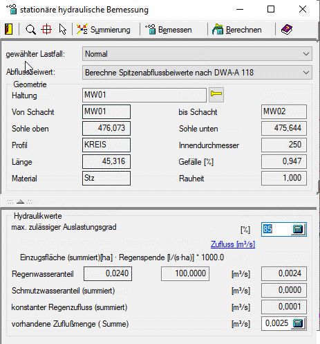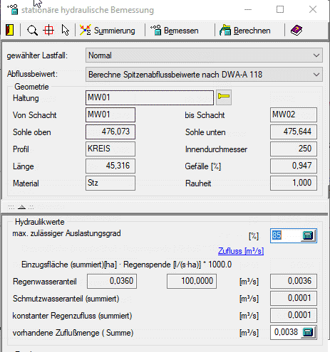 Bei der Bemessungsfunktion werden die Zulaufmengen aus den strömungstechnisch, oberhalb liegenden Netzabschnitten summiert und über die Teilfüllungstabellen für geschlossene Profile nach Prandtl/Colebrook unter Berücksichtigung von Gefälle und Auslastungsgrad mit dem vorhandenen Innendurchmesser der Haltung berechnet.