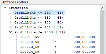 Die Ergebnisübersicht ist in Form eines Baumdiagramms aufgebaut. Durch Anklicken des +-Zeichens vor den einzelnen Kriterien wird eine Liste der zugehörigen Elemente geöffnet.