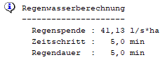 Angegeben werden hier die effektive Regenspende im Intervall, sowie der berechnete Zeitschritt und die damit insgesamt gerechnete Regendauer.
