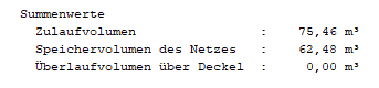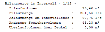 Zusätzlich werden Angaben zur Änderung des Speichervolumens des Netzes innerhalb des Zeitschrittes und Überlaufmengen gemacht.