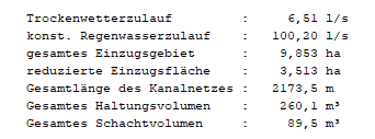 Die Ausgaben zur Bilanztabelle enthalten zuerst netzbezogene Parameter die wichtig zur Interpretaion der Zulauf- und Speichermengen sind.