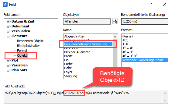 Wichtig: Dieses Feld kann jetzt nur auf diesem Layout benutzt werden, da es mit dem gewählten Ansichtsfenster verknüpft ist. Es wird also immer der Maßstab dieses einen Ansichtsfensters ausgegeben. Wird das Ansichtsfenster entfernt oder kopiert, muss das Feld neu erzeugt werden.