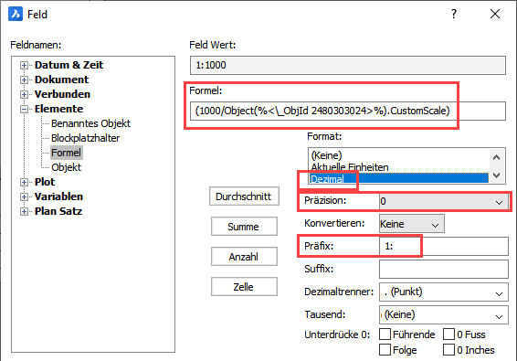 Für die Ausgabe des Maßstabs auf dem Layout soll das Format 1:n verwendet werden. Diese Ausgabe muss über eine eigene Formel mit Formatanweisung erstellt werden
