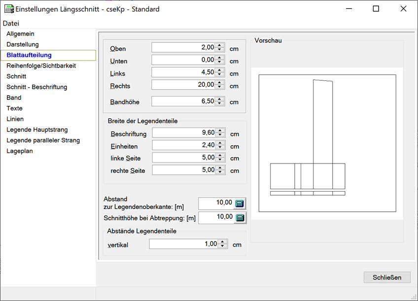 Hiermit geben Sie die Abstände der Längsschnittdarstellung (Schnitt mit Legende) zum Blattrand an.