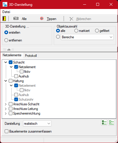 Die 3D-Darstellung dient zur Visualisierung eines Kanalnetzes im Raum. Dies kann z. B. zur Kollisionsprüfung genutzt werden. Ebenfalls wird die 3D-Darstellung benötigt, um die Geometrie und Lage des Netzes als IFC-Daten für ein BIM-Modell übergeben zu können.