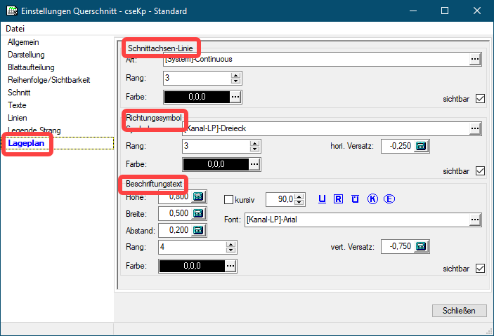Ob die Beschriftung eines Profils im Lageplan zu sehen ist oder nicht, wird in den Schnittparametern gesteuert (s.o. „Definitionseinstellungen“) und kann damit für jeden Schnitt einzeln festgelegt werden. Wie diese Darstellung gestaltet ist, wird im Bereich „Lageplan“ der Querschnittseinstellungen voreingestellt. Hier ist es möglich, ähnlich wie in den Netztypeinstellungen für die Netzelemente, die Schnittliniendarstellung, das Richtungssymbol und den Beschriftungstext zu parametrisieren.