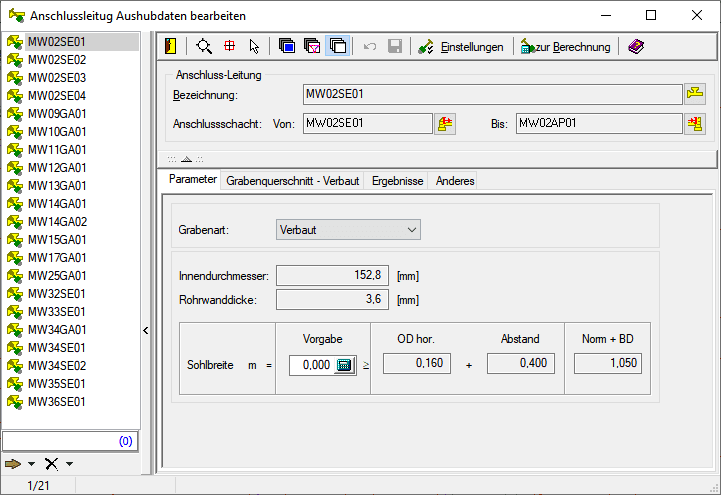 Parameter und Berechnungsergebnisse in den darrunterliegenden Registerkarten