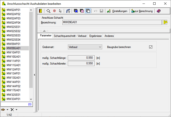 Die weiter Vorgehensweise im Dialog und der Berechnungsablauf entspricht den Ausführungen unter Datenbank - Schacht.