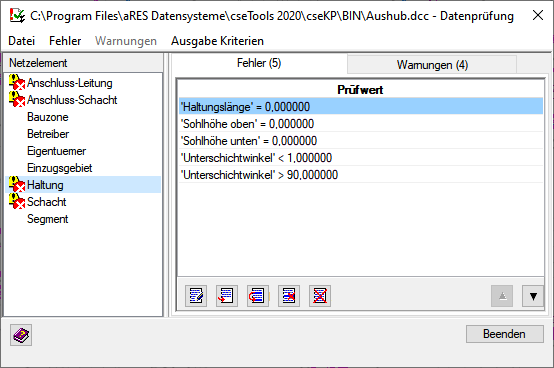 Eine Datenprüfung definiert sich aus einzelnen oder mehreren Vergleichen von Attributwerten mit vorgegebenen Werten. Diese Vergleiche können als Warnung oder als Fehler deklariert werden. (Sie erscheinen dann bei Durchführung der Datenprüfung im Protokoll als Fehler und Warnungen.)