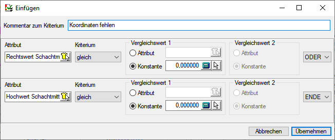Verbirgt sich hinter dem Gewählten Attribut kein numerischer Wert, so stehen folgende Kriterien nicht zur Verfügung: größer, größer gleich, kleiner, kleiner gleich, nicht ganzzahlig, innerhalb, außerhalb | |||