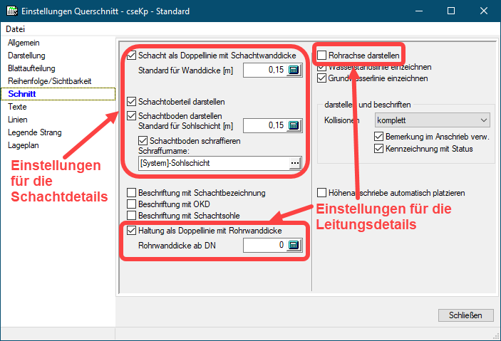 Sind durch die entsprechenden Eingaben in den Geometriedaten der darzustellenden Objekte die Voraussetzungen gegeben, kann im Bereich „Schnitt“ der Querschnittseinstellungen gesteuert werden, welche Details im Schnitt dargestellt werden sollen.