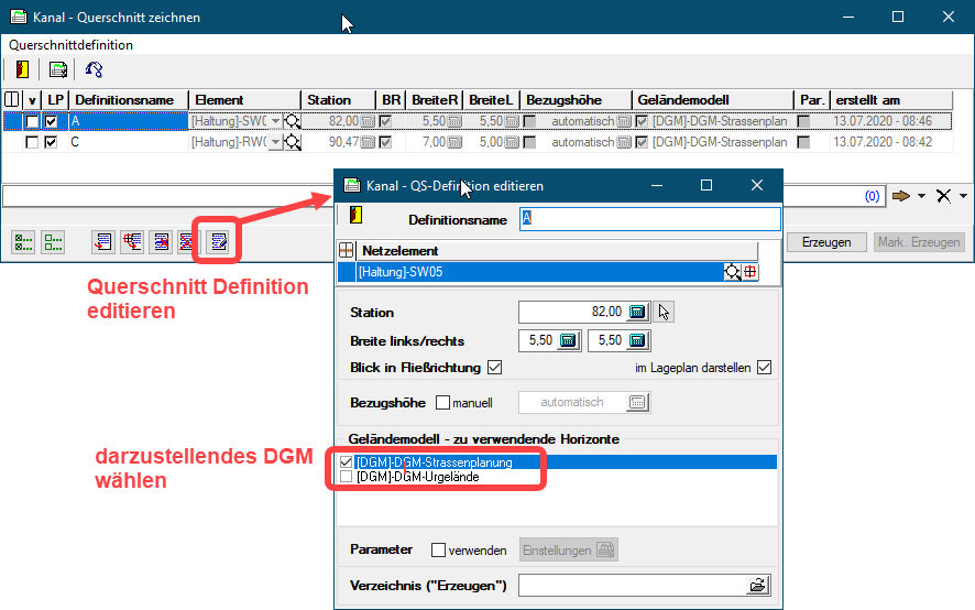 Im Dialog „Querschnitt-Definition editieren“ können die im Schnitt darzustellenden Geländehorizonte gewählt werden.