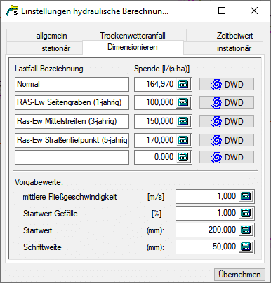 Im Register Dimensionieren können für die stationäre hydraulische Berechnung verschiedene Lastfälle mit einer entsprechenden Regenspende definiert werden.