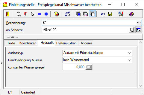 Die Hydraulikdaten für Einleitungsstellen können in der folgenden Registerkarte eingegeben und geändert werden.