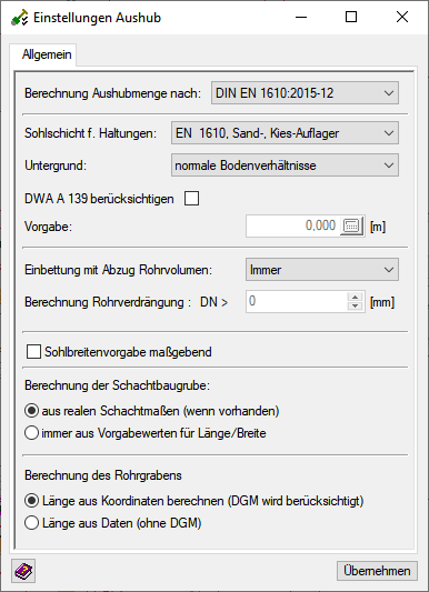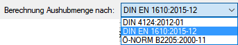 Hier können Sie die Berechnungsvorschrift festlegen nach der die Aushubberechnung durchgeführt wird. Zur Auswahl stehen DIN 4124, EN 1610 und OEN B2205.