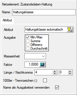 Zunächst wird der Name des Elements vergeben. Danach wird das Attribut gewählt, welches ausgewertet werden soll. Sie wählen die Art der Ausgabe sowie die Maßeinheit. Dann erfolgt die Eingabe des Faktors mit dem die Werte multipliziert werden sollen.