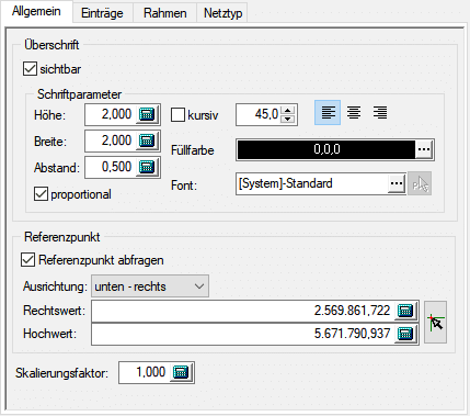 Unter der Registerkarte Allgemein werden zum einen die Parameter für die Überschrift festgelegt. Dort kann auch die Überschrift an- bzw. ausgeschalten werden.