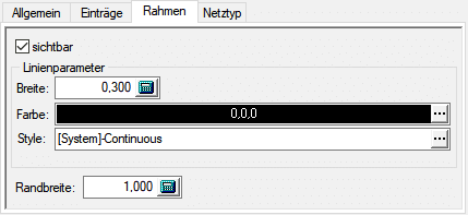 Unter dem Kartenreiter Rahmen können die Linienparameter für den Rahmen bestimmt werden. Ebenfalls kann unter Randbreite der Abstand zwischen Rahmen und Inhalt der Legende festgelegt werden.