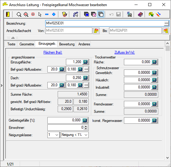 Die Parameter Summe Fläche, gewicht. Abfl.-beiwert, Einwohner, Summe Trockenwetter und konst. Regenwasserzulauf werden bei der Zulaufsummierung auf die angeschlossene Haltung übertragen und bei den hydraulischen Berechnungen berücksichtigt.