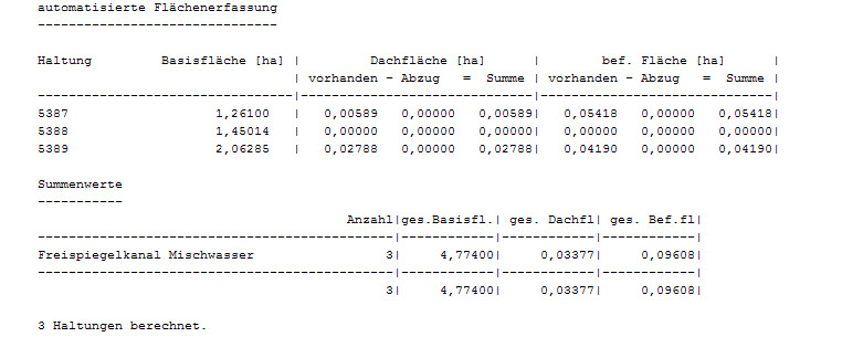 Gibt es Haltungen, denen bewusst kein Einzugsgebiet zugeordnet ist, so erfolgt hier zwar eine Hinweismeldung, aber die Funktion kann trotzdem ausgeführt werden. Dies gilt auch für Mischwasser-Haltungen, denen kein Einzugsgebiet, Typ Regenwasser, zugeordnet ist. Diese Haltungen erhalten im Ergebnis nur den Flächenwert für Gesamtfläche, die Flächenwerte Dachfläche und befestigte Fläche werden zu 0.0 gesetzt (vergleiche Datenbank, Haltung, Register Hystem-Extran).