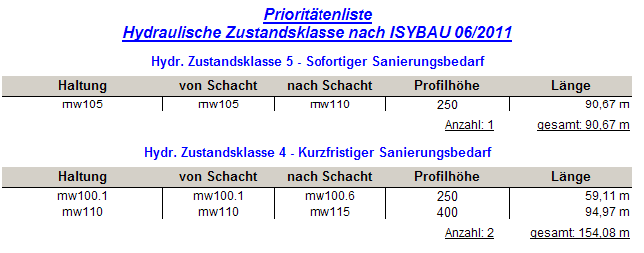 Im Dialog Bereiche bearbeiten wird über die Schaltfläche Bericht mit Fastreport die Prioritätenliste für Haltungen vom bearbeiteten Abwassernetz mit dem Report Prioritätenliste nach hydraulischer Zustandsklasse erzeugt.