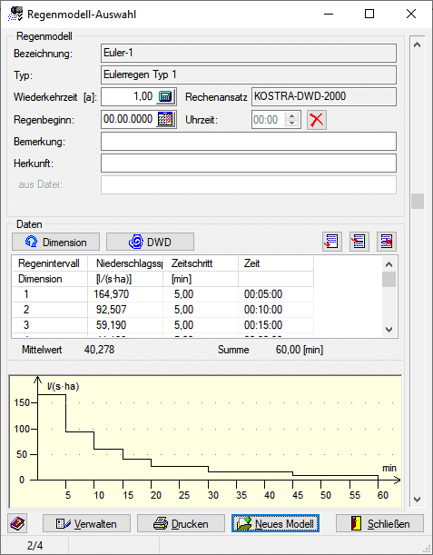Der bei der Berechnung der Modellregen nach Euler verwendete Rechenansatz wird im Dialog angezeigt und im Regenmodell gespeichert.