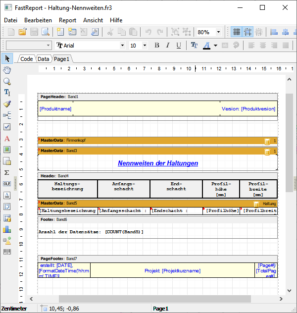 Voraussetzung für die Datenausgabe ist eine an FastReport gebundene Datenbank, die durch die vorangestellte Funktion Auswahl Netzelement aus dem Basissystem-Projekt generiert wird.