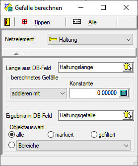Hinweis: Die Berechnung von Gefällewerten ist in erster Linie zu verwenden, wenn die automatische Berechnung des Gefälles deaktiviert ist (vgl. Einstellungen, Allgemein).