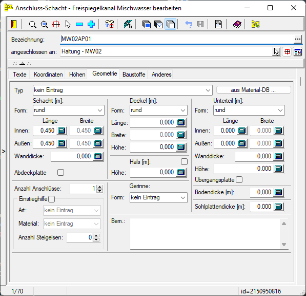 Das Material der Schachtbauteile Schachthals, Schachtoberteil und Schachtunterteil werden auf die Schachtbaustoffe, im Register Baustoffe, übernommen. Sind alle Materialien gleich wird dieses Material auch unter Schachtbaustoff eingetragen. Bestehen die genannten Schachtbauteile aus verschiedenen Baustoffen, so werden beim Schachtbaustoff unterschiedliche Werkstoffe eingetragen.