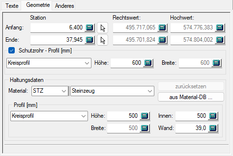 Hier kann ein Schutzrohr/-raum im Bereich des Segments definiert werden. Es können Profil/-höhe/-breite eingegeben werden, um diesen genauer zu beschreiben.