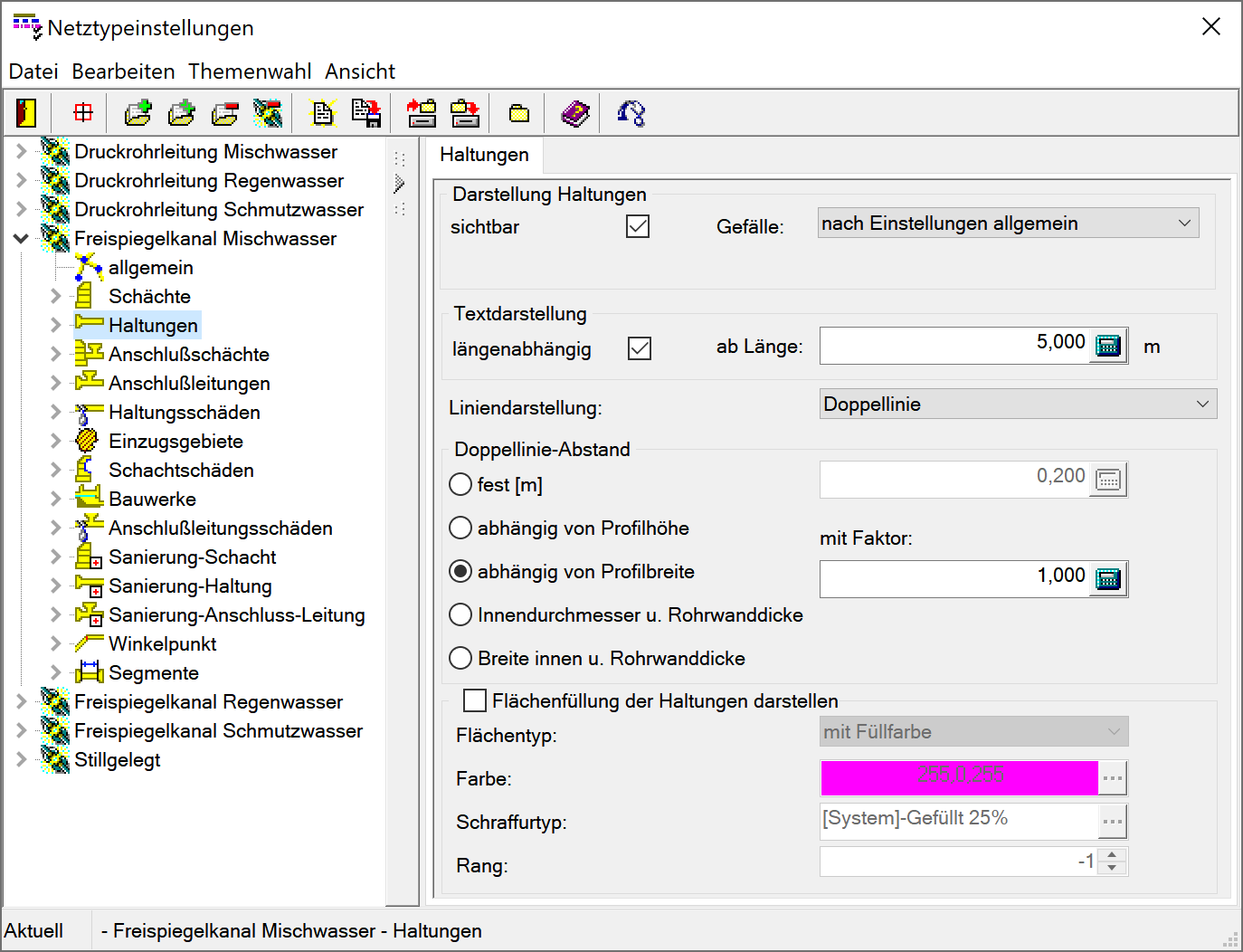 Über diese Auswahl wird festgelegt, ob die Haltungen als Doppellinie oder Einfachlinie dargestellt werden sollen. Je nach Auswahl stehen nachfolgend unterschiedliche Einstellungen zur Auswahl.