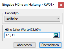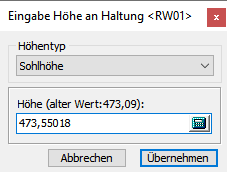 Wählen sie den Höhentyp und geben Sie den gewünschten Höhenunterschied ein. Dabei muss der eingegebene Wert größer gleich 0 und kleiner gleich der Differenz von Deckelhöhe und eingestelltem Horizont sein, damit er als gültiger Wert akzeptiert wird. Die Eingabe erfolgt im Dialog.