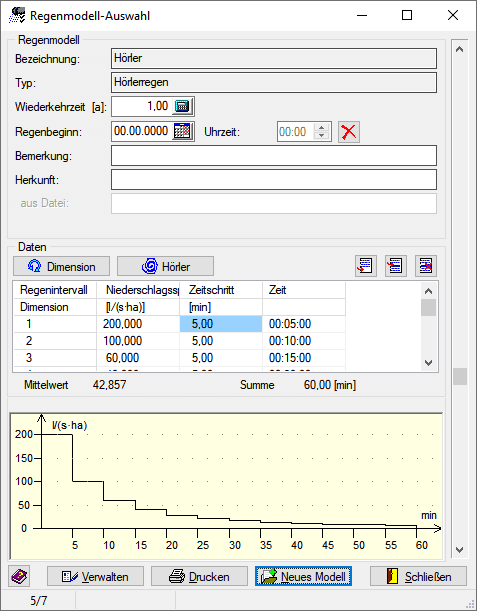 Unter Verwendung der vorhandenen Ortskonstanten einer Regenstation aus der Schweiz und der eingestellten Regenhäufigkeit wird dieser Modellregen erzeugt.